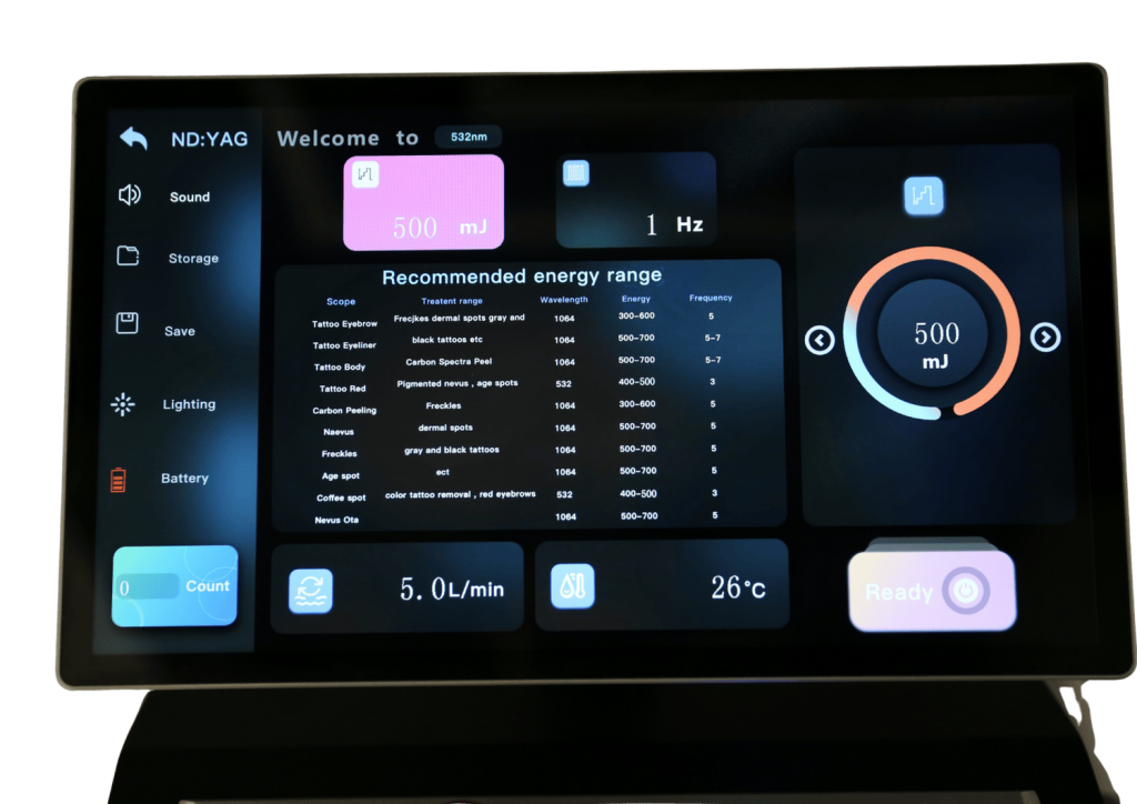 Zaawansowane urządzenie laserowe Q-Switch z głowicą o mocy  500 W w aż czterech zakresach wiązki 1064nm, 532nm, 1320nm i 755nm. Urządzenie wykorzystuje innowacyjną technologię do eliminacji tatuaży, makijażu permanentnego, przebarwień skórnych oraz peelingu węglowego. Znajduje również zastosowanie w leczeniu grzybicy paznokci, usuwaniu brodawek i wykonywaniu peelingu węglowego.